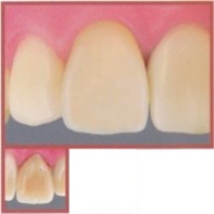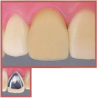 ■40%ゴールドの合金に、表側の面のみ樹脂を貼って白くした物です。咬む面、裏側は銀色になります。保険の材料より強化したプラスチックを使用しているため着色、変色が少なくなります。自然の歯に比べ、透明感は劣ります。